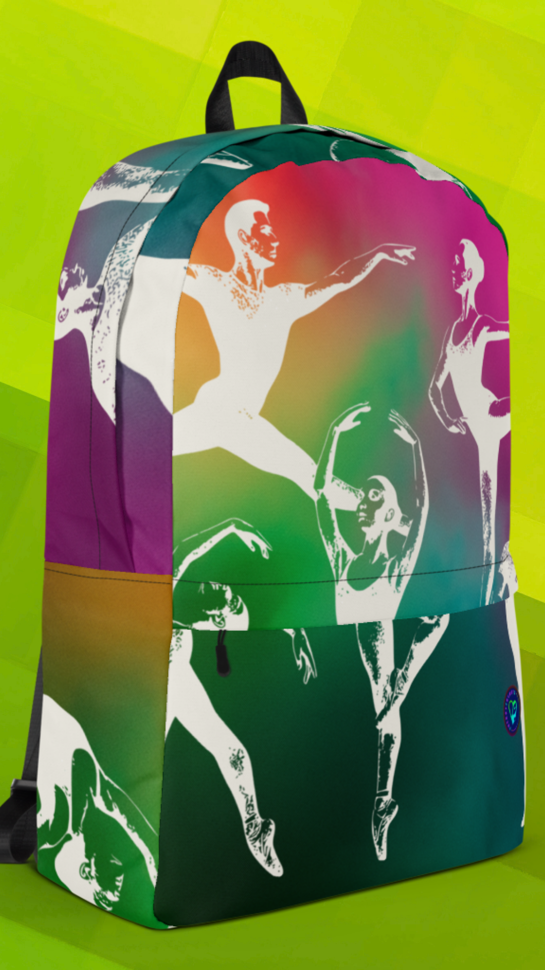 Carry your love for the arts wherever you go! This all-over print backpack brings the elegance of ballet to life with vibrant Technicolor dancers front and center. The sleek black back and straps keep it grounded and versatile while the front stays bold, bright, and on pointe. Whether you're headed to class, rehearsal, or just living that artsy life, this backpack is your perfect standing ovation in motion.
