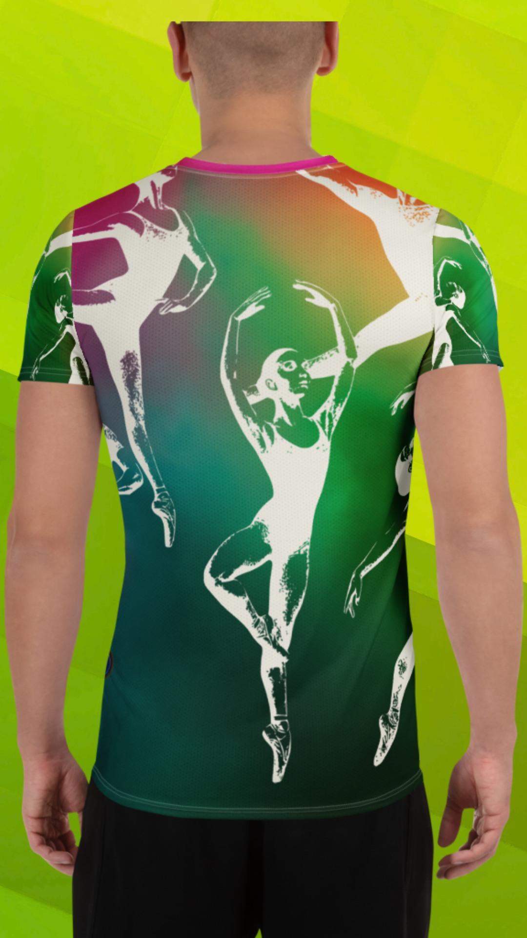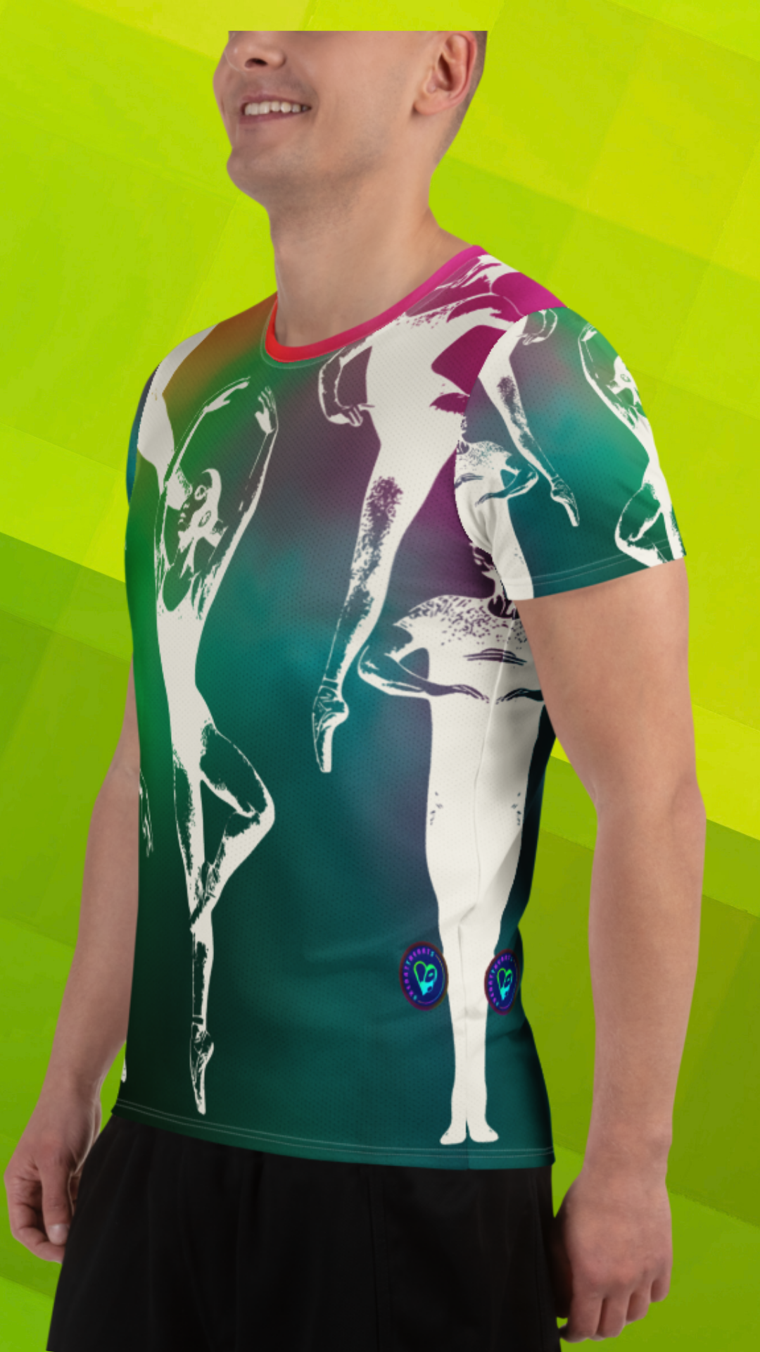 Balance meets boldness in this Heart The Arts™ Technicolor standout in all-over print. From the leap to the pirouette, this vibrant ballet design takes center stage—literally. With this men's ballet athletic t-shirt, you're on pointe!