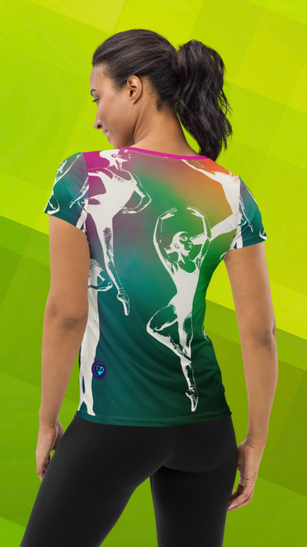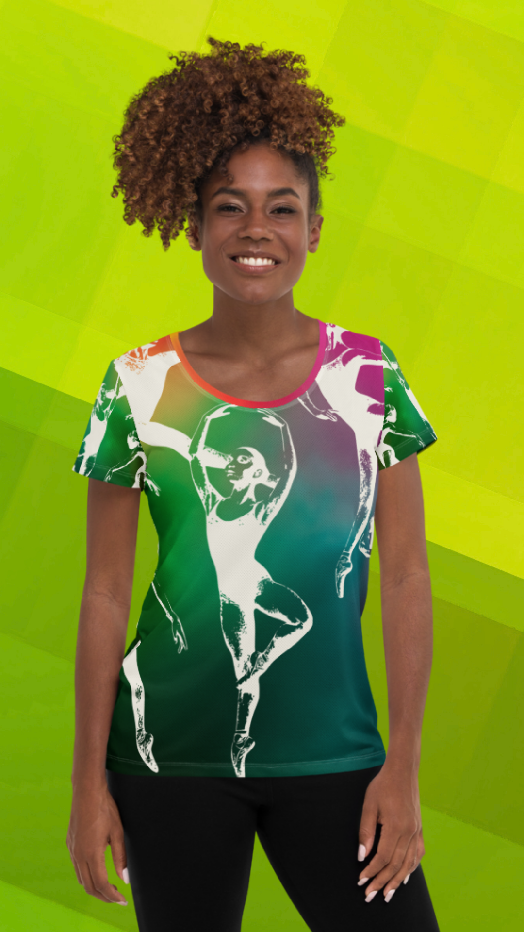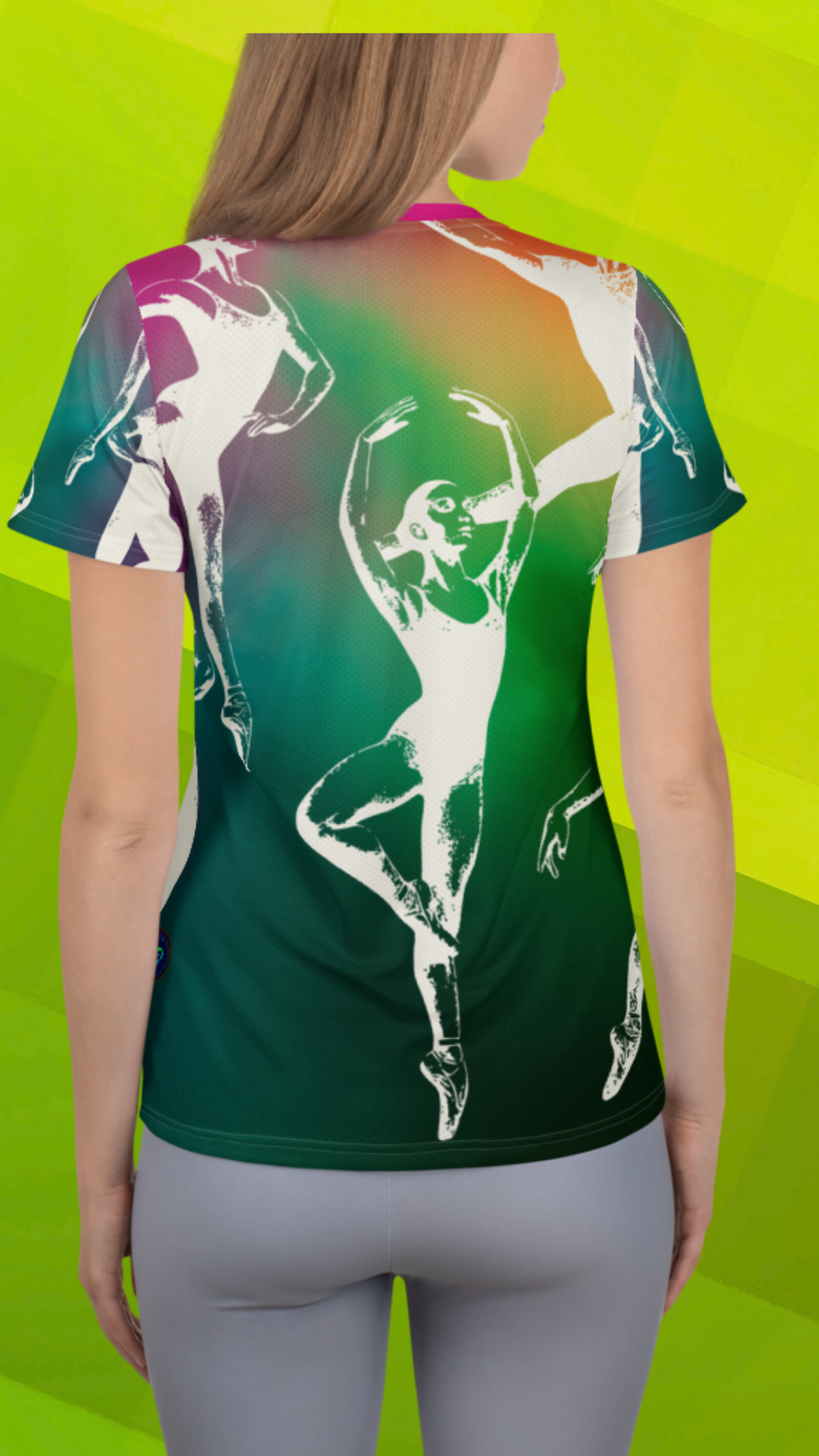 Grace meets boldness in this Heart The Arts™ Technicolor standout in all-over print. From the leap to the pirouette, this vibrant ballet design takes center stage—literally. With this ballet sports tee, you're on pointe!